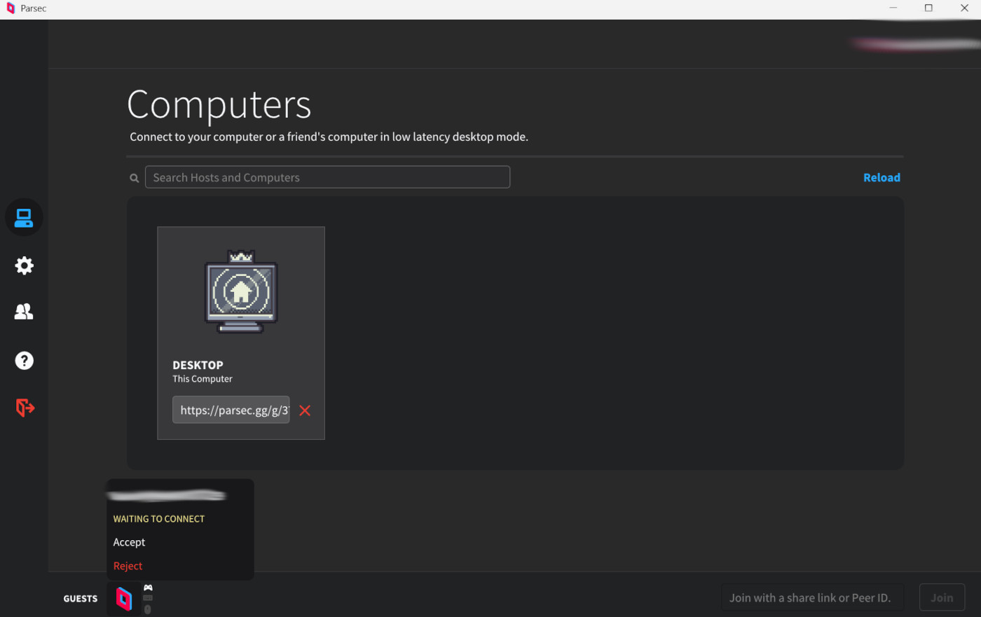 进入软件主页面,中间的Desktop则是你的电脑,你可以点击Share分享给他人,这时候你的剪切板里会多出一行邀请链接,你只需要复制给你的朋友,他们就可以在Parsec的主页右下角输入这串神秘的代码,向你发起访问请求了。