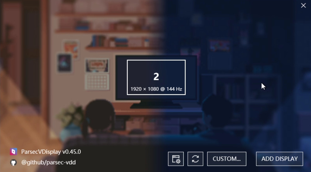 安装完成后的页面是下面这样,点击ADD Display则可以添加一个虚拟的显示器。这个软件会骗过主机,告诉它“你现在接入了一个xx分辨率xx刷新率的显示器”。这样你就可以通过这个方式+Parsec串流,最终达成无实体显示器远端控制的目的。