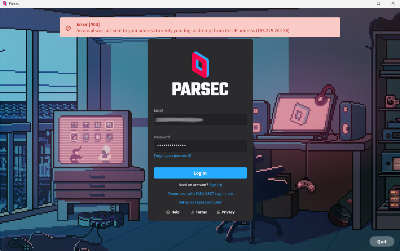 此时可以不对后续页面做出任何设定与回应。直接返回到官网主页,再次点击Try Parsec Now→,然后找到上方Already have an account? [Log in],输入刚刚注册用的Email与密码,就完成了登录。