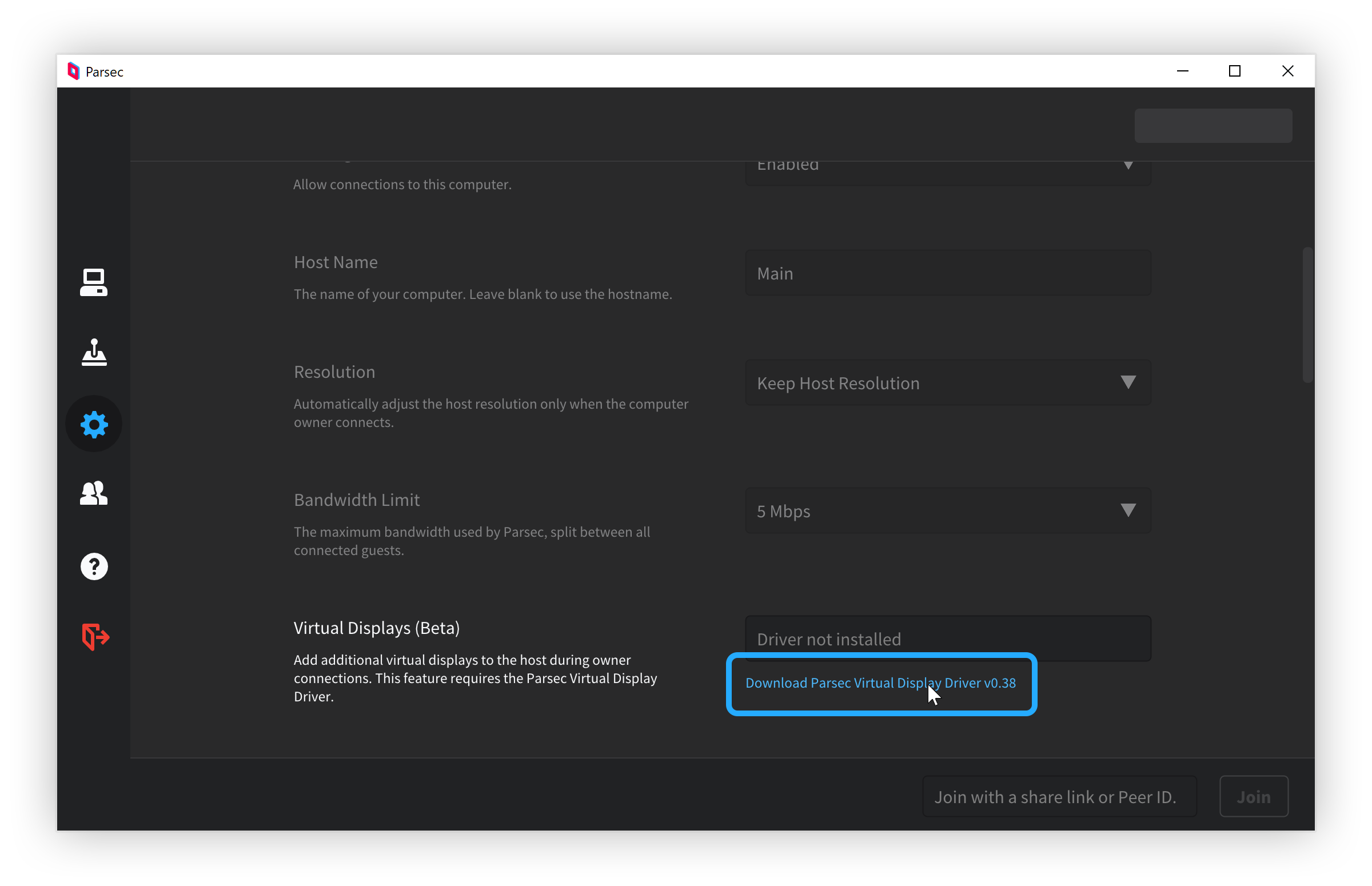 前面提到过,如果你勾选了Virtual Display Driver,那么也只是安装了一个虚拟显示器的驱动,你仍然需要在设置的Host选项卡中找到Virtual Display下载,才可以在Parsec中使用它。