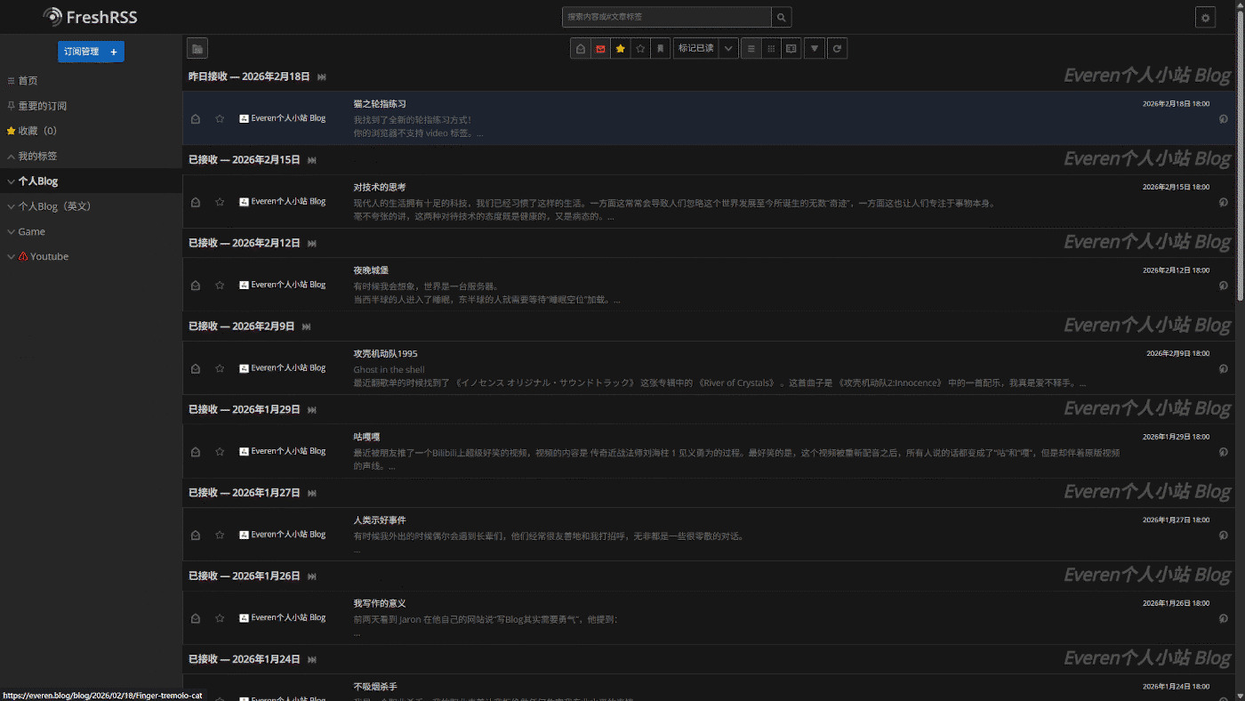前段时间架设了自己的FreshRSS,在一段时间的体验过后,它已经悄无声息地成为了我生活中的一部分。